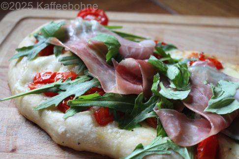 Der Teig besteht nicht nur aus Weizenmehl sondern auch aus Reis- und Kichererbsenmehl. Der Teig ist dicker und knuspriger als mein gewöhnlicher Pizzateig. Uns hat die Pinsa super geschmeckt.