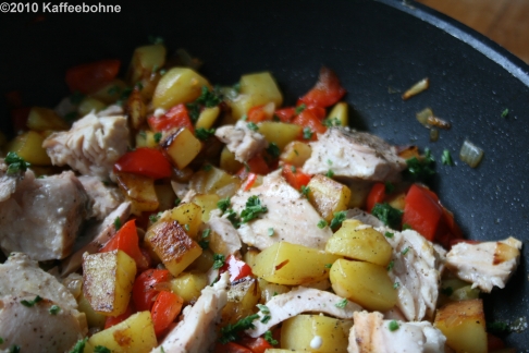Nachdem meine Tochter sich immer noch wöchentlich Fischstäbchen wünscht und mein Sohn und ich diese nicht mehr wollen, essen wir dann immer gebratenen Lachs mit wechselnden Beilagen. Da kam mir das Rezept von Petra gerade recht. Da ich im Dorfsupermarkt einen Stremellachs bekommen habe, habe ich das Lachsfilet in der Pfanne gebraten und dann gewürfelt zur Pfanne gegeben.