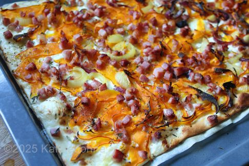 Titel: | Kürbisflammkuchen mit Speck und Schmand |