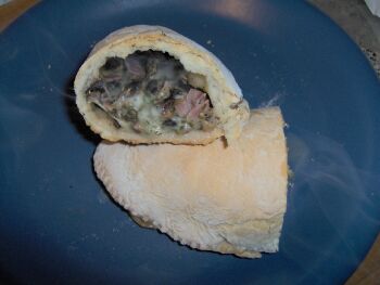 Gestern gab es dann diese Calzoni, wobei ich das Rezept nur als Anregung genommen habe. Ich habe sie mit Schinken, Mozzarella und Campignons gefüllt. Verschlossen habe ich sie mit meinem genialen Ravioli-Blitz , der immer noch darauf wartet seiner eigentlichen Bestimmung gerecht zu werden.