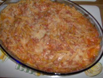5. Bei 200 °C etwa 40 min lang backen. Der Auflauf soll nur goldgelb, nicht braun werden, damit er nicht austrocknet.