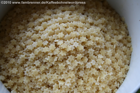 Für uns war die Kombinationen von Anchovis, Sultanien, Knoblauch und Zwiebeln eher ungewöhnlich, aber es war recht schnell zubereitet und es hat sehr lecker geschmeckt. Man muß die Nudeln nur gut mischen, denn wenn man nur Nudeln mit Bröseln erwischt, dann ist das eine eher trockene Angelegenheit.