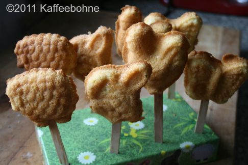 Sie hat sofort die Form für die Lolly Cakes gesehen. Wir hatten schon mal darüber gesprochen, weil sie irgendwo Lolly Cakes gegessen hatte. Also haben wir die Form (mit den putzigen Tieren: v.l.n.r.: Schaf, Hase mit Knickohr, Huhn, Schmetterling) gekauft.