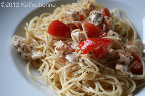 Die Nudeln einlaufen lassen und sorgfältig unterheben. Oregano und Knoblauch zufügen, köcheln lassen, bis die Teigwaren al dente sind. Mit der Sojasauce abschmecken.